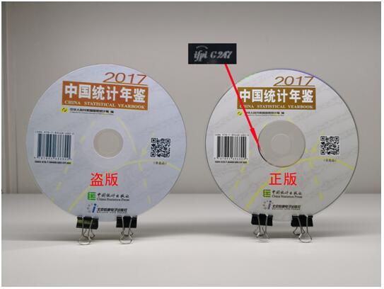 正版光盘内圈刻有模具SID码,《中国统计年鉴-2017》的编号为:IFPI G247,读者可上网查询光盘复制单位。而盗版光盘内圈被打印贴纸覆盖,无任何信息。