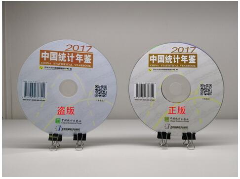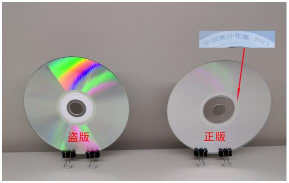 从反面看,正版光盘数据面光洁度高、反光均匀,而盗版光盘数据面光洁度差、光盘较薄、有刻录痕迹、有划痕。正版光盘内圈中间磁道上有"中国统计年鉴-2017"字样,而盗版光盘中间磁道没有此字样。